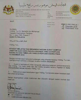 LATEST, Dec 7 - In response to query on the withdrawal of the Istana Negara invitation to Tun Dr Mahathir Mohamad for the oath taking ceremony of the new King and his Deputy scheduled for Dec 13, the following is the reproduction of the letter. Thank you.